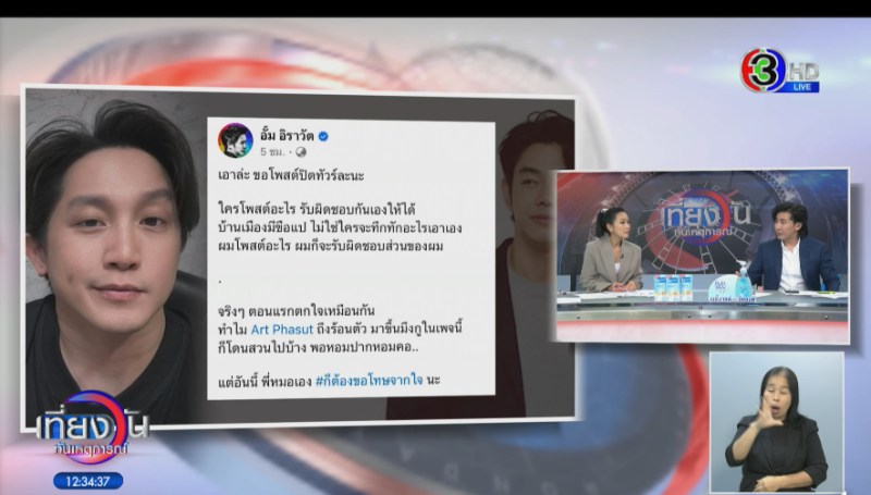 จากกรณีประเด็นดราม่าร้อนแรงสนั่นโซเชียลสำหรับ หมออั้ม อิราวัต และ อาร์ต พศุตม์ ล่าสุดวันที่ 27 พ.ค. 68 ในรายการ เที่ยงวันทันเหตุการณ์ ทางด้านพิธีกรชื่อดังอย่าง หนุ่ม กรรชัย ได้พูดประเด็นดักล่าว หลัง อาร์ต ได้ท้าหมออั้มออกโหนกระเเส โดยเผยว่า หมออั้มบอกขอโทษแล้วกัน ถ้าทำให้อาร์ตคิดว่าเป็นตัวอาร์ต แต่อาร์ตยังไม่จบ