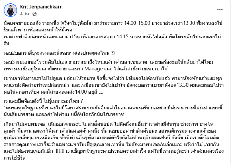 เป็นอีกหนึ่งอดีตผู้ประกาศข่าวชื่อดังสำหรับ กฤต เจนพานิชการ ที่ล่าสุดทำเอาเจ้าตัวเดือดเลยทีเดียวเมื่อ แม่ค้าออนไลน์ จากเพจดังรายนึง ได้ตกลงมาออกรายการ แต่พอจะถึงเวลากลับแคนเซิลคิวกลางอากาศ โดยให้เหตุผลว่าไม่มีคนมาดูแล ผ่านเฟซบุ๊ค Krit Jenpanichkarn ระบุว่า นัดเพจขายของดัง รายหนึ่ง (จริงๆไม่รู้ดังมั้ย) มาร่วมรายการ 14.00-15.00 นางมาล่วงเวลา13.30 ทีมงานลงไปรับแล้วพามาห้องแต่งหน้าให้นั่งรอ