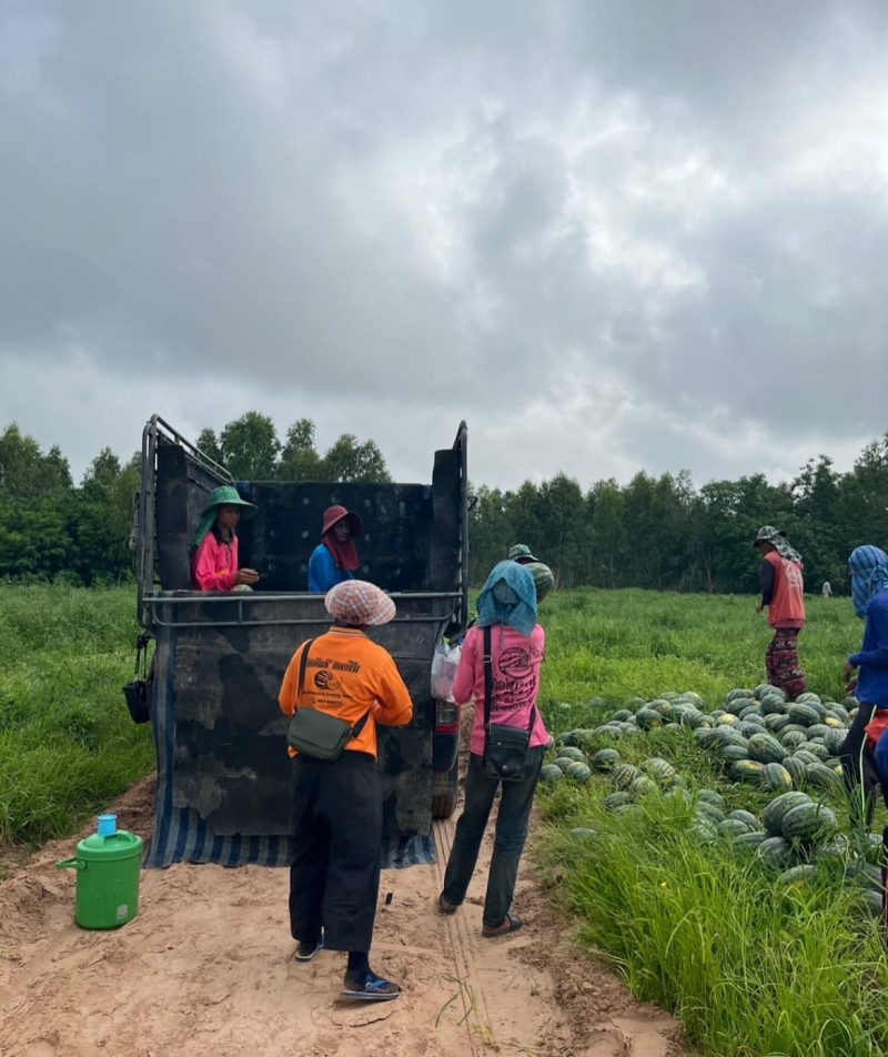 โดย มีข้อความระบุว่า เห็นแตงโมเหลือโลละบาท.. เลยเหมาชาวบ้านจังหวัดราชบุรีมาส่ง กทม. กินได้ทั้งหมู่บ้านเลยจริงๆ