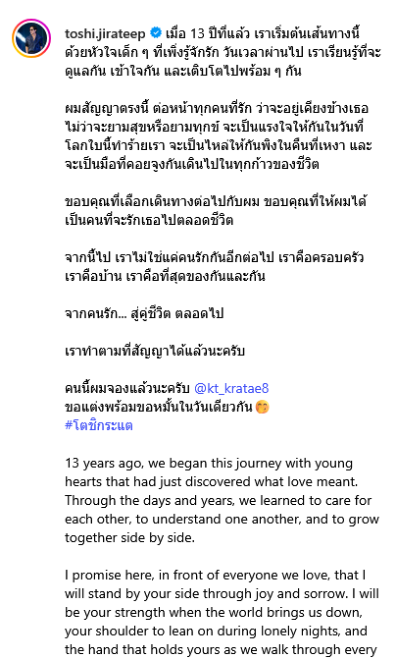 ทั้งนี้ทางด้าน โตชิ ยังได้เผยอีกว่า เมื่อ 13 ปีที่แล้ว เราเริ่มต้นเส้นทางนี้ด้วยหัวใจเด็ก ๆ ที่เพิ่งรู้จักรัก วันเวลาผ่านไป เราเรียนรู้ที่จะดูแลกัน เข้าใจกัน และเติบโตไปพร้อมๆ กัน ผมสัญญาตรงนี้ ต่อหน้าทุกคนที่รัก ว่าจะอยู่เคียงข้างเธอไม่ว่าจะยามสุขหรือยามทุกข์ จะเป็นแรงใจให้กันในวันที่โลกใบนี้ทำร้ายเรา จะเป็นไหล่ให้กันพิงในคืนที่เหงา และจะเป็นมือที่คอยจูงกันเดินไปในทุกก้าวของชีวิต
