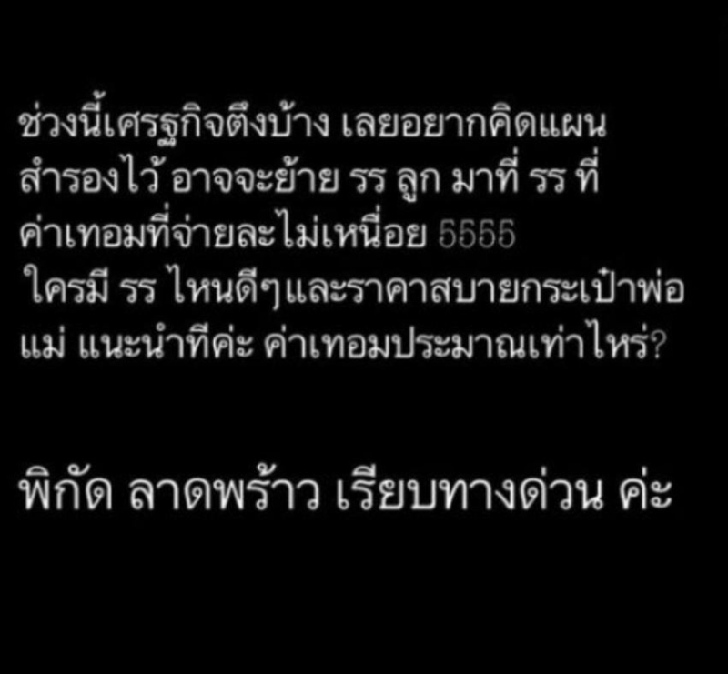 โดย มีข้อความว่า ช่วงนี้เศรษฐกิจตึงบ้าง เลยอยากคิดแผนสำรองไว้ อาจจะย้าย รร.ลูกมาที่รร.ที่ค่าเทอมที่จ่ายแล้วไม่เหนื่อย ใครมี รร. ไหนดี และราคาสบายกระเป๋าพ่อแม่ แนะนำทีค่ะ ค่าเทอมประมาณเท่าไหร่ พิกัดลาดพร้าวเลียบทางด่วนค่ะ