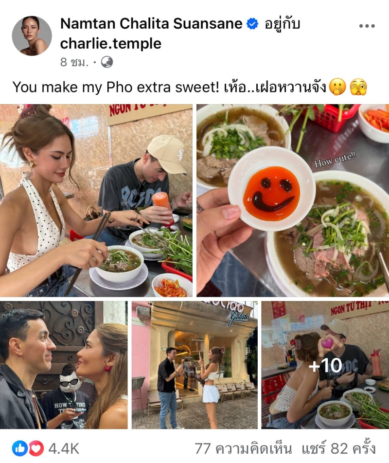 ล่าสุด น้ำตาล ก็ได้ออกมาโพสต์ภาพคู่กับแฟนจากทริปเที่ยวเวียดนามลงเฟซบุ๊ก พร้อมแคปชั่นเบาๆ แต่ทำใจละลาย ว่า You make my Pho extra sweet เห้อ เฝอหวานจัง ก่อนจะแชร์ซ้ำไปอีกเพจหนึ่ง พร้อมแคปชั่นสั้นๆ ว่า หวานแบบไม่เติมน้ำตาล