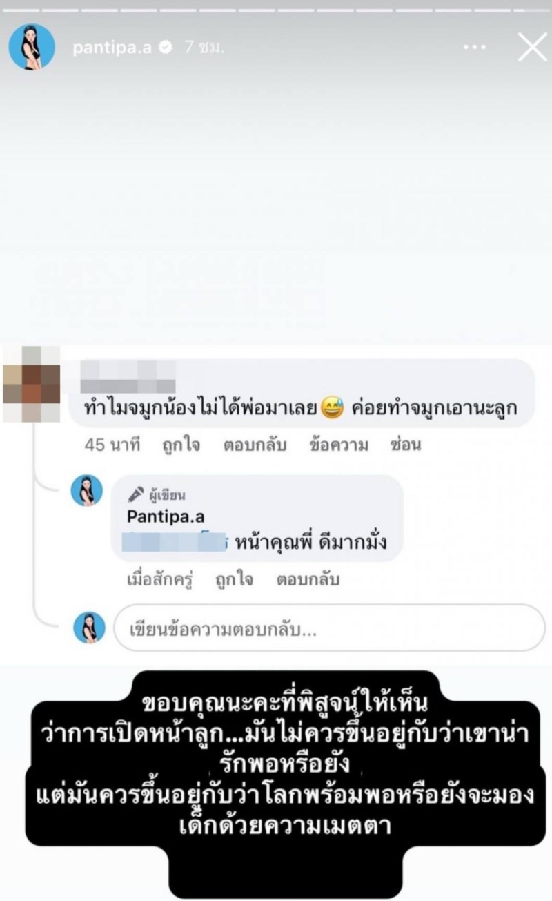 งานนี้ ปุ้ย ไม่ปล่อยผ่าน รีบฟาดกลับแบบจุกๆ ว่า หน้าคุณพี่ ดีมากมั้ง ก่อนจะพูดต่ออย่างมีคลาสว่า ขอบคุณนะคะที่พิสูจน์ให้เห็นว่า การเปิดหน้าลูก มันไม่ควรขึ้นอยู่กับว่าเขาน่ารักพอหรือยัง แต่มันควรขึ้นอยู่กับว่าโลกพร้อมพอหรือยัง จะมองเด็กด้วยความเมตตา