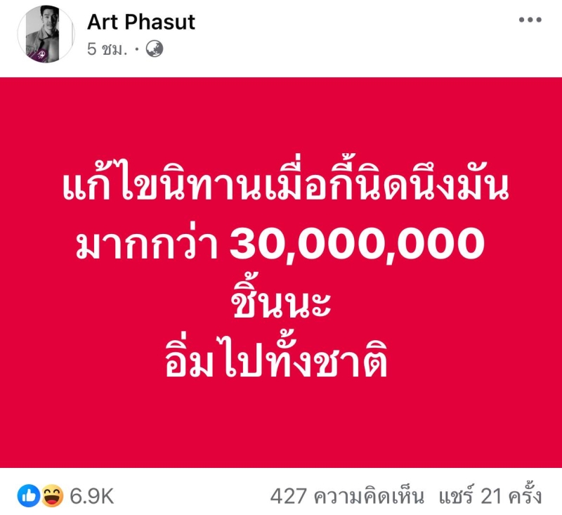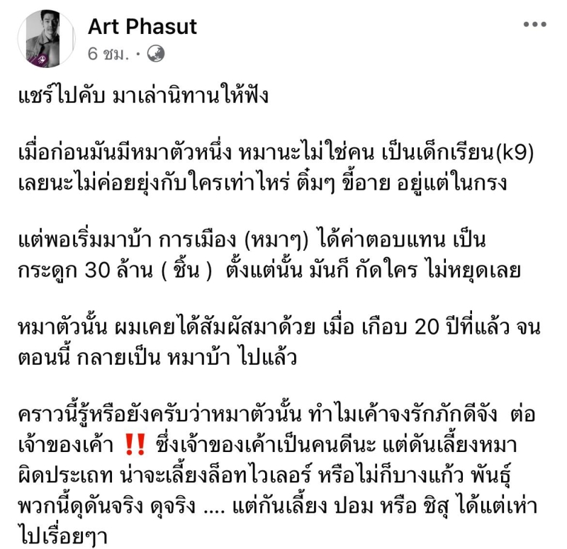 โดย อีกหนึ่งจุดพีคคือ นิทานปริศนา ที่อาร์ตโพสต์ลงเฟซบุ๊ก เล่าถึง หมาบ้า ตัวหนึ่งที่เคยติ๋มๆ แต่พอได้กระดูก 30 ล้านก็เริ่มกัดทุกคนไม่หยุด พร้อมเปรียบเปรยว่าเจ้าของหมาเป็นคนดี แต่เลี้ยงผิดพันธุ์ แถมปิดท้ายด้วยคำว่า แก้ไขนิทาน มันมากกว่า 30 ล้านชิ้น อิ่มไปทั้งชาติ
