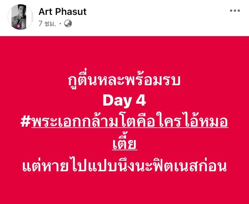 ล่าสุด เช้าวันนี้ 30 พฤษภาคม อาร์ต โพสต์อีกครั้งว่า ตื่นละ พร้อมรบ Day 4 พร้อมลุยฟิตเนส ก่อนจะเปิดเผยข้อความแชท ที่หลายคนรอคอย ท่ามกลางกระแสจับตาอย่างหนักจากโซเชียล