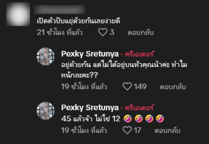 โดยมีชาวเน็ตเข้ามาคอมเมนต์แซะว่า เปิดตัวปุ๊บอยู่ด้วยกันเลยง่ายดี ทางด้านเป็กกี้ สวนกลับทันทีบอกว่า อยู่ด้วยกัน แต่ไม่ได้อยู่บนหัวคุณน้าค่ะ ทำไมหนักละคะ?? , 45 แล้วจ้า ไม่ใช่ 12
