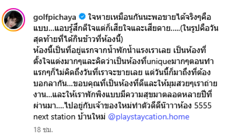 เรียกได้ว่าเป็นอีกหนึ่งนักร้องหนุ่มมากความสามารถสำหรับ กอล์ฟ พิชญะ ที่ล่าสุดได้ออกมาโพสต์ภาพบ้านหลังเเรกในชีวิต หลังหลังขายบ้านสุดรักสำเร็จ พร้อมแคปชั่นสุดซึ้งผ่านอินสตาแกรม golfpichaya ระบุว่า ใจหายเหมือนกันนะพอขายได้จริงๆคือแบบ แอบรู้สึกดีใจแต่ก็เสียใจและเสียดาย..(ในรูปคือวันสุดท้ายที่ได้กินข้าวที่ห้องนี้)