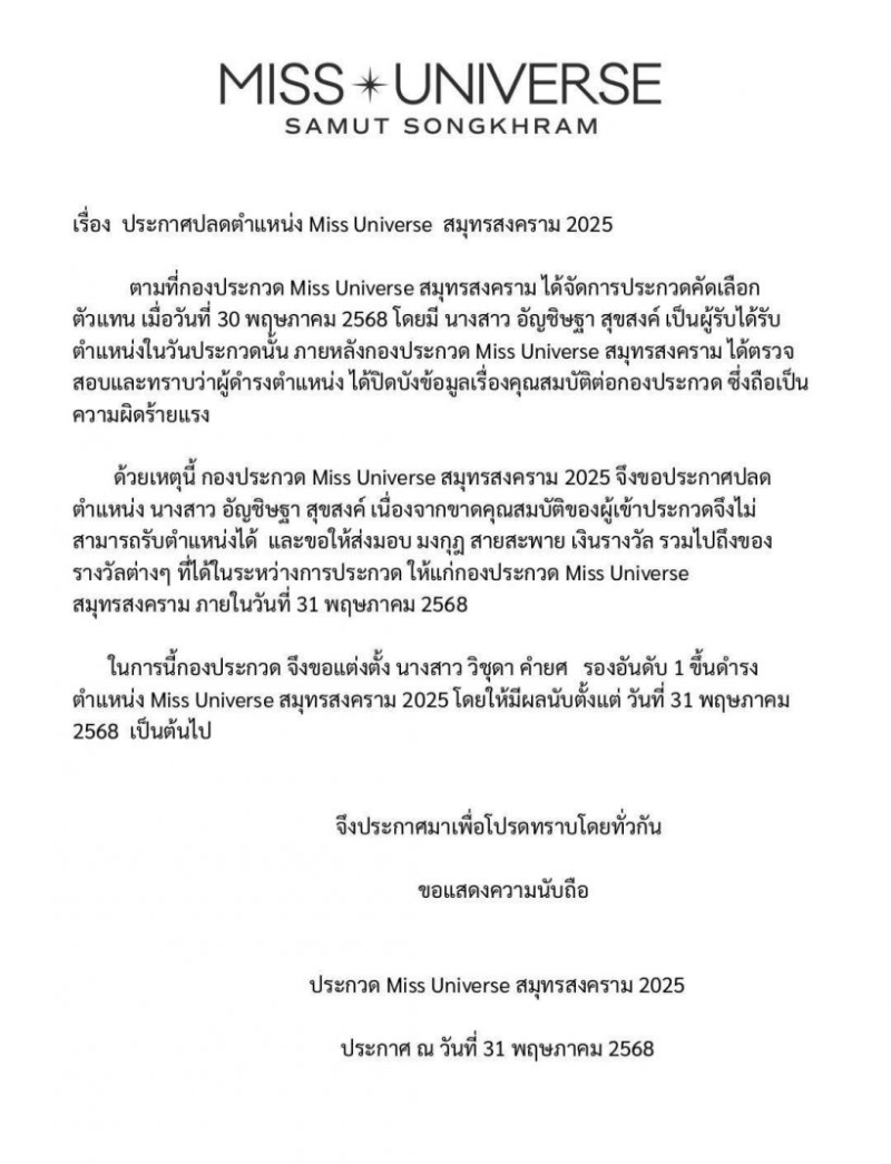 เรื่อง ประกาศปลดตำแหน่ง Miss Universe สมุทรสงคราม 2025