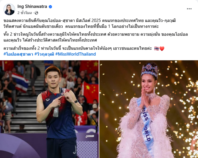 หลังจากที่นายกรัฐมนตรี อุ๊งอิ๊ง แพทองธาร ชินวัตร โพสต์ผ่านเฟซบุ๊ก Ing Shinawatra แสดงความยินดีกับ วิว กุลวุฒิ วิทิตศานต์ และ โอปอล สุชาตา ช่วงศรี หลังคว้ามงกุฎ Miss World 2025 เป็นคนแรกของไทยในรอบ 72 ปี และเป็นนักแบดมินตันชายเดี่ยวไทยคนแรกที่ขึ้นเป็น มือ 1 ของโลก โดยเผยว่า ทั้งสองข่าวใหญ่ในวันนี้ สร้างความภูมิใจให้คนไทยทั้งประเทศ ความมุ่งมั่นของคุณโอปอลและคุณวิวจะเป็นแรงบันดาลใจให้น้องๆ เยาวชนและคนไทย