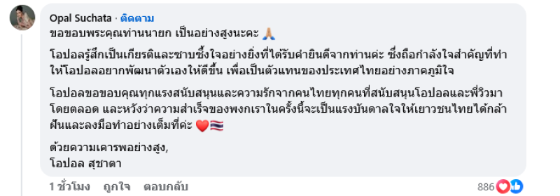 ทั้งนี้ โอปอล ได้เข้ามาตอบกลับว่า ขอขอบพระคุณท่านนายก เป็นอย่างสูงนะคะ โอปอลรู้สึกเป็นเกียรติและซาบซึ้งใจอย่างยิ่งที่ได้รับคำยินดีจากท่านค่ะ ซึ่งถือกำลังใจสำคัญที่ทำให้โอปอลอยากพัฒนาตัวเองให้ดีขึ้น เพื่อเป็นตัวแทนของประเทศไทยอย่างภาคภูมิใจ