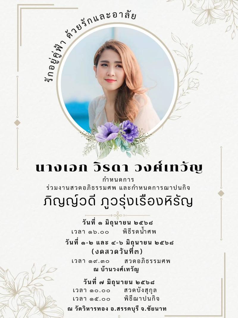 วันที่ 7 มิ.ย. 2568 10.00 น. สวดบังสุกุล และ 15.00 น. พิธีฌาปนกิจ ที่วัดวิหารทอง อ.สรรคบุรี จ.ชัยนาท