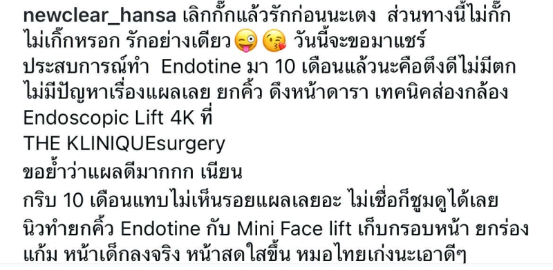 โดย เจ้าตัวเผยผ่านทางโซเชียลส่วนตัว ซึ่ง มีข้อความว่า เลิกกั๊กแล้วรักก่อนนะเตง ส่วนทางนี้ไม่กั๊กไม่เกิ๊กหรอก รักอย่างเดียว วันนี้จะขอมาแชร์ประสบการณ์ทำ Endotine มา 10 เดือนแล้วนะ คือตึงดีไม่มีตก ไม่มีปัญหาเรื่องแผลเลย ยกคิ้ว ดึงหน้าดารา เทคนิคส่องกล้อง Endoscopic Lift 4K
