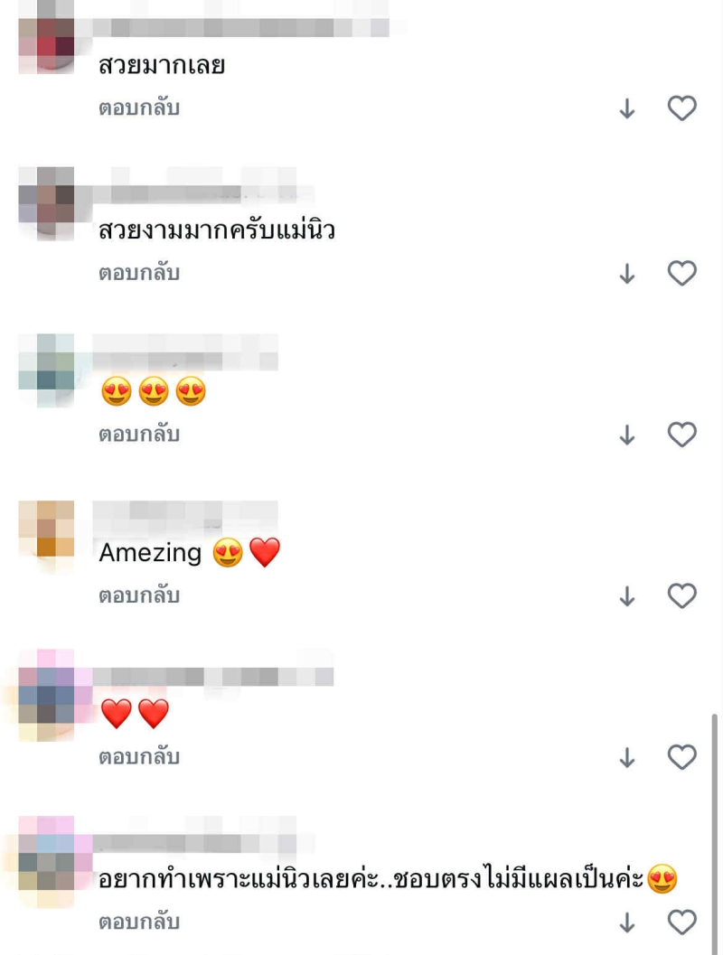 หลังจากนั้น มีชาวเน็ตหลายคน แห่เข้ามาคอมเมนต์กันอย่างล้นหลาม เช่น สวยมาก , สวยงามมากครับแม่นิว , Amezing , อยากทำเพราะแม่นิวเลยค่ะ ชอบตรงไม่มีแผลเป็นค่ะ เป็นต้น
