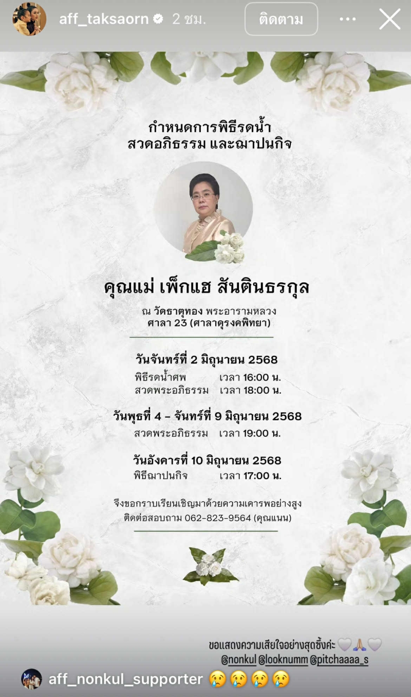 ทางด้าน แอฟ ยังได้รีโพสต์กำหนดการพิธีรดน้ำศพ สวดอภิธรรม และฌาปนกิจคุณแม่ เพ็กแฮ พร้อมแท็กถึง นนกุล และครอบครัว เพื่อส่งต่อความรู้สึกห่วงใยอย่างเงียบๆ แต่ลึกซึ้ง และหลายคนทราบดีว่า แอฟ และครอบครัวของนนกุลนั้นสนิทกันมาก โดยเฉพาะความสัมพันธ์ของทั้งคู่ ที่ถูกจับตามองในฐานะคู่รัก ที่คอยเป็นกำลังใจให้กันมาตลอด