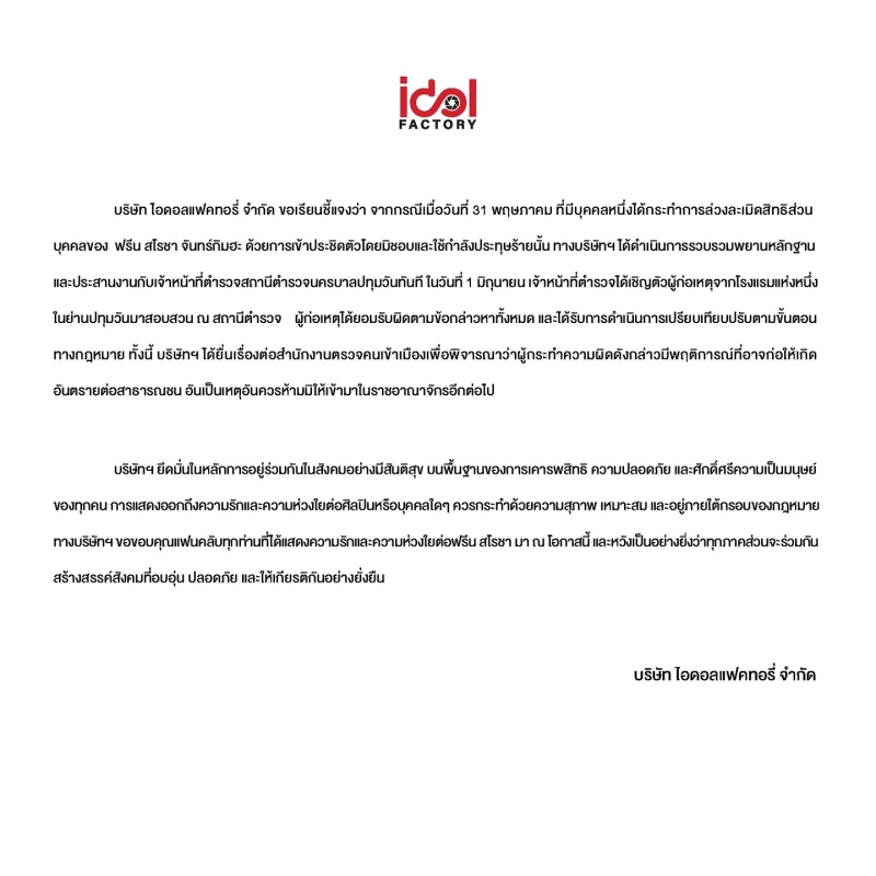 จากกรณีเมื่อวันที่ 31 พฤษภาคม ที่มีบุคคลหนึ่งได้กระทำการล่วงละเมิดสิทธิส่วนบุคคลของฟรีน สโรชา ด้วยการเข้าประชิดตัวโดยมิชอบและใช้กำลังประทุษร้ายนั้น ทางด้านบริษัท ไอดอลแฟคทอรี่ จำกัด ได้ดำเนินการรวบรวมพยานหลักฐานและประสานงานกับเจ้าหน้าที่ตำรวจสถานีตำรวจนครบาลปทุมวันทันที
