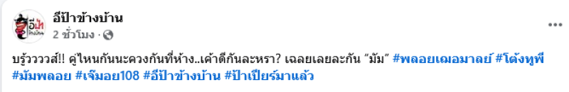 จากกรณีประเด็นที่ทางด้านเพจ เจ๊มอย108 V1 ได้ออกมาโพสต์เปิดประเด็นว่า อินึงเห็นเขาเดินด้วยกันที่เอ็มควอเทียละจ้า.. xูถึงว่าแม่สดใสไวมาก xูคนแรกเลย..บรู้วววววววส์ #อิพิมเมียทนายเจมส์ ท่ามกลางชาวเน็ตต่างเข้ามาคอมเมนต์กันอย่างมาก อาทิ คู่หน้า อิโมจิหอย ไหม,ถ้าคู่นั่น อาหารหมาทั้งประเทศแน่นอน