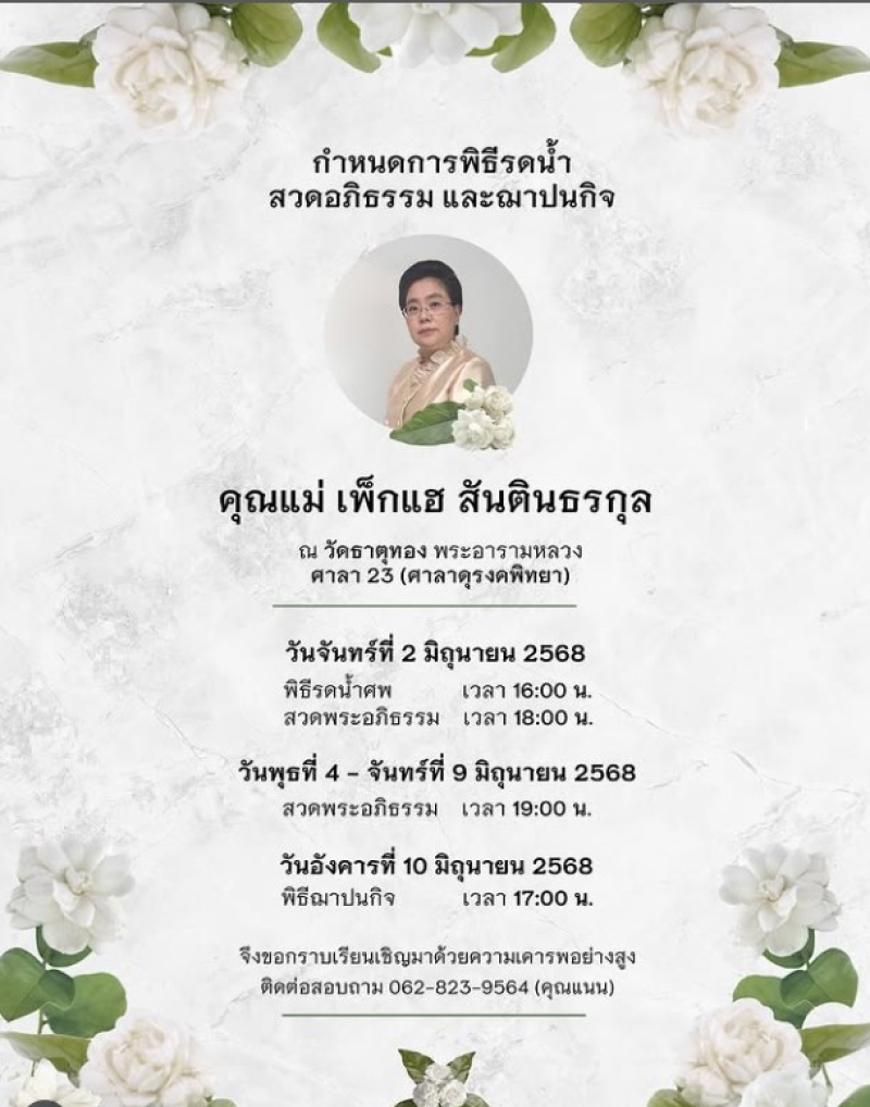 เมื่อเวลา 14.00 น. วันที่ 2 มิถุนายน 2568 ณ ศาลา 23 (ศาลาดุรงคพิทยา) วัดธาตุทอง พระอารามหลวง (ที่เดียวกับที่เคยจัดงานศพคุณพ่อของแอฟ) มีการจัดพิธีรดน้ำศพคุณแม่เพ็กแฮ ท่ามกลางบรรยากาศอันสงบและโศกเศร้า