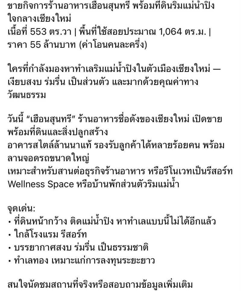 โดย ลานนา โพสต์ผ่านเฟซบุ๊กส่วนตัวว่า ขายกิจการร้านอาหารเฮือนสุนทรี พร้อมที่ดิน 553 ตร.วา พื้นที่ใช้สอยกว่า 1,000 ตร.ม. ราคา 55 ล้านบาท (ค่าโอนคนละครึ่ง) พร้อมระบุว่า เหมาะสำหรับทำธุรกิจร้านอาหาร รีสอร์ท หรือบ้านพักส่วนตัว