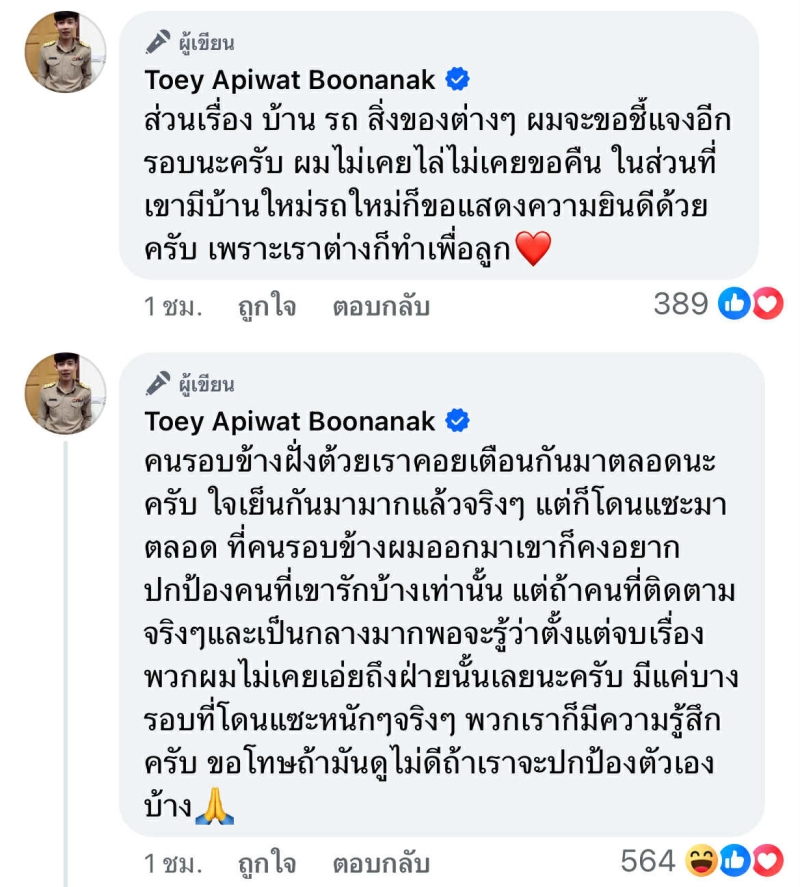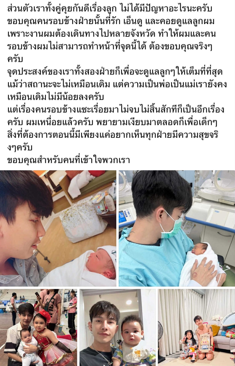 อีกทั้ง เต้ย ยังยืนยันว่า แม้สถานะจะเปลี่ยน แต่ความเป็นพ่อแม่ยังเหมือนเดิม พร้อมย้ำว่า ไม่ได้มีปัญหาอะไรกับบ้าน หรือทรัพย์สินที่ฝ่ายหญิงถือครอง และขอแสดงความยินดีกับสิ่งใหม่ๆ ในชีวิตของเธอ