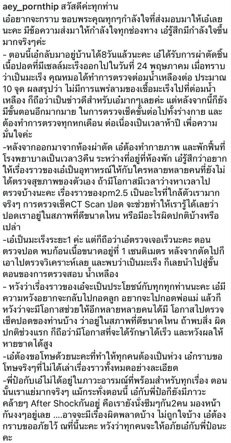 ทางด้าน เธอ ยังกล่าวอีกว่า อยากกลับไปกอดลูก กอดพ่อแม่ และหวังว่าประสบการณ์ครั้งนี้ จะกระตุ้นให้คนหันมาตรวจสุขภาพก่อนสายเกินไป หากพบเร็วก็มีโอกาสรักษาให้หายขาดสูง พร้อมกล่าวขอโทษที่ทำให้หลายคนเป็นห่วง และไม่ได้บอกเล่าเรื่องราวให้ละเอียดก่อนหน้านี้