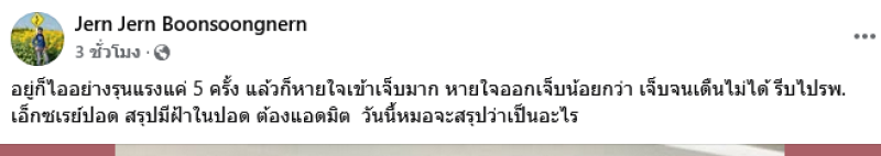 อยู่ก็ไออย่างรุนแรงแค่ 5 ครั้ง แล้วก็หายใจเข้าเจ็บมาก หายใจออกเจ็บน้อยกว่า เจ็บจนเดินไม่ได้ รีบไปรพ. เอ็กซเรย์ปอด สรุปมีฝ้าในปอด ต้องแอดมิต วันนี้หมอจะสรุปว่าเป็นอะไร ท่ามกลางแฟนๆเเละคนในวงการต่างส่งกำลังใจให้กันอย่างมาก