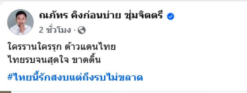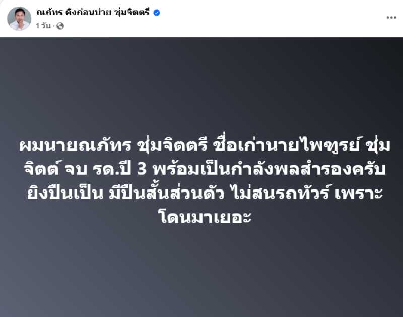 เรียกได้ว่าเป็นอีกหนึ่งตลกดังสำหรับ คิง ก่อนบ่าย หรือ ณภัทร ชุ่มจิตตรี เจ้าของวลีแสบๆ คันๆ ได้ออกมาโพสต์ข้อความผ่านเฟซบุ๊ค ณภัทร คิงก่อนบ่าย ชุ่มจิตตรี พร้อมระบุข้อความว่า ผมนายณภัทร ชุ่มจิตตรี ชื่อเก่านายไพฑูรย์ ชุ่มจิตต์ จบ รด.ปี 3 พร้อมเป็นกำลังพลสำรองครับ ยิงปืนเป็น มีปืนสั้นส่วนตัว ไม่สนรถทัวร์ เพราะโดนมาเยอะ