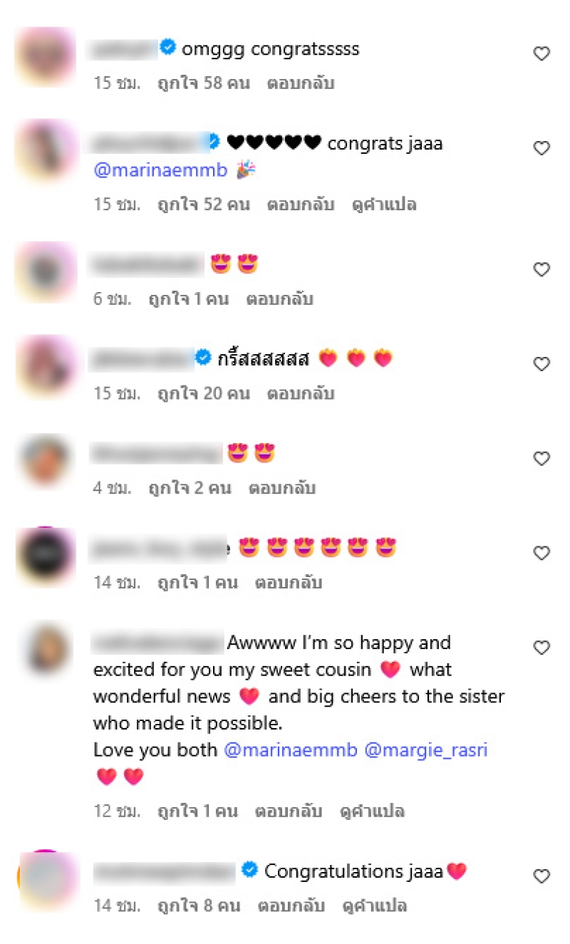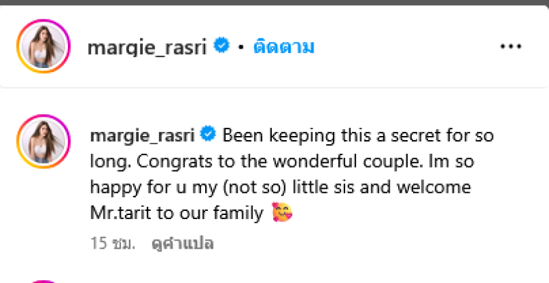 โดยทางด้าน มาร์กี้ ราศรี ได้ออกมาโพสต์ภาพโมเมนต์ผ่านทางอินสตาแกรม margie_rasri พร้อมเขียนข้อความระบุว่า Been keeping this a secret for so long. Congrats to the wonderful couple. Im so happy for u my (not so) little sis and welcome Mr.tarit to our family