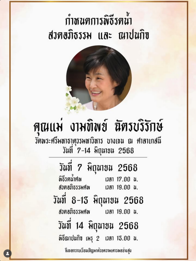 นับว่าเป็นอีกหนึ่งความสูญเสียของคนในวงการบันเทิงสำหรับการจากไปของคุณแม่งามทิพย์ ฉัตรบริรักษ์ แม่ของพระเอกดังอย่าง บอย ปกรณ์ ที่ล่าสุดได้ออกมาโพสต์แจ้งข่าวเศร้าเเละกำหนดการงานอาลัยคุณแม่ พร้อมข้อความระบุว่า คุณแม่เดินทางไกลแล้วครับ เรียนเชิญทุกท่านมาส่งคุณแม่ครับ