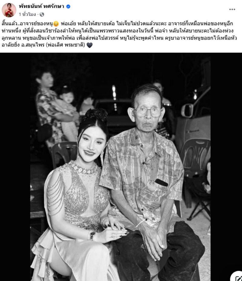 เป็นอีกหนึ่งนักร้องหมอลำสาวสำหรับ แพรวพราว แสงทอง ที่ล่าสุดได้ออกมาแจ้งข่าวเศร้าผ่านทางเฟซบุ๊ค พัทธนันท์ ทศรักษา ระบุว่า สิ้นแล้ว..อาจารย์ของหนู พ่อเอ้ย หลับให้สบายเด้อ ไม่เจ็บไม่ปวดแล้วนะคะ อาจารย์ก็เหมือนพ่อของหนูอีกท่านหนึ่ง