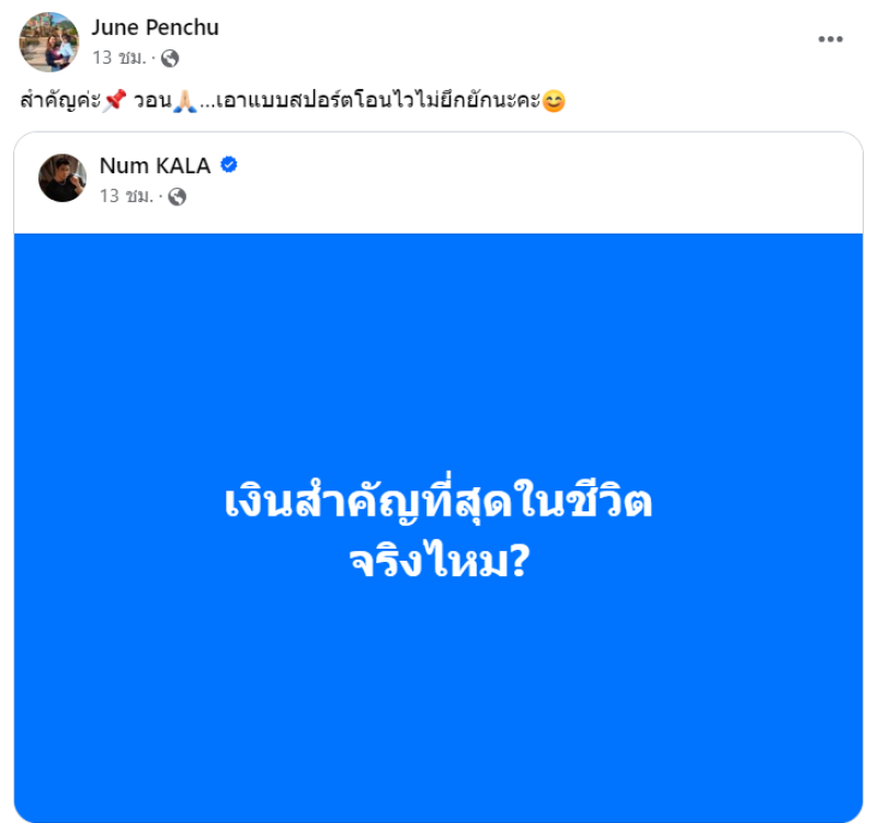 ล่าสุด ทางหนุ่ม กะลา ได้โพสต์ว่า เงินสำคัญที่สุดในชีวิต จริงไหม? และทางจูนเองก็ได้แชร์โพสต์นั้น และใส่แคปชั่นว่า สำคัญค่ะ วอน…เอาแบบสปอร์ตโอนไวไม่ยึกยักนะคะ