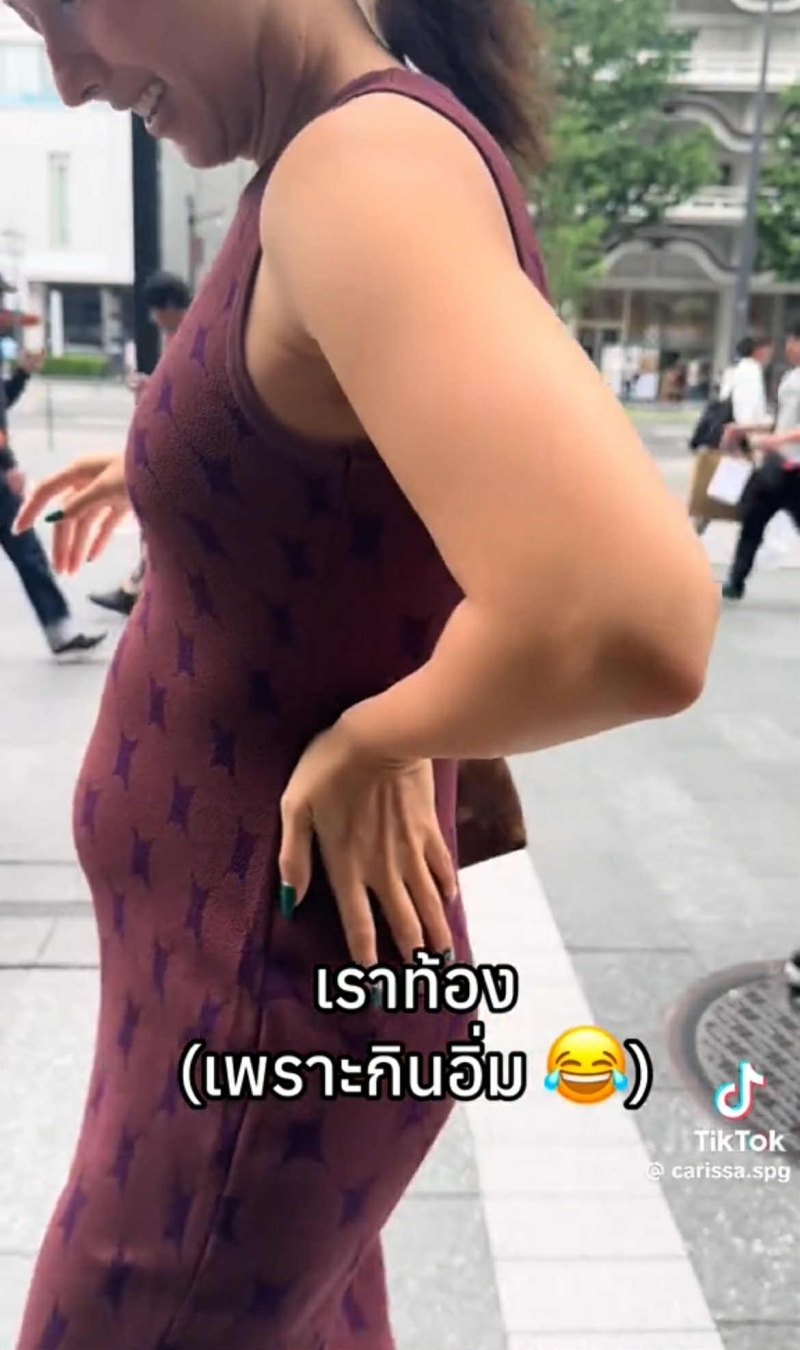 อีกทั้ง เธอ ยังได้เผยอีกว่า หน้าท้องที่เห็นนั้นไม่ได้มาจากข่าวลือใดๆ แต่เป็นผลจากการกินแบบจัดเต็ม พร้อมทิ้งมุกว่า ดีใจมั้ยคะ ท้องก่อนแต่ง