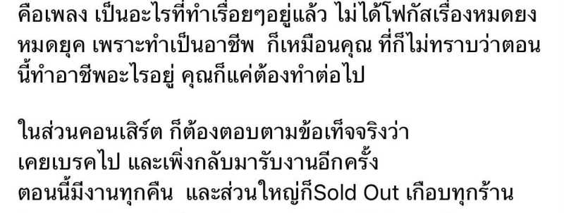 ทางด้าน เรื่องคอนเสิร์ต เจ้าตัวยืนยันว่า พักงานไปช่วงหนึ่ง แต่ตอนนี้กลับมารับงานเต็มที่ ทุกคืนมีโชว์ และส่วนใหญ่ Sold Out พร้อมตอกกลับแบบสุภาพ แต่แซ่บถึงใจ