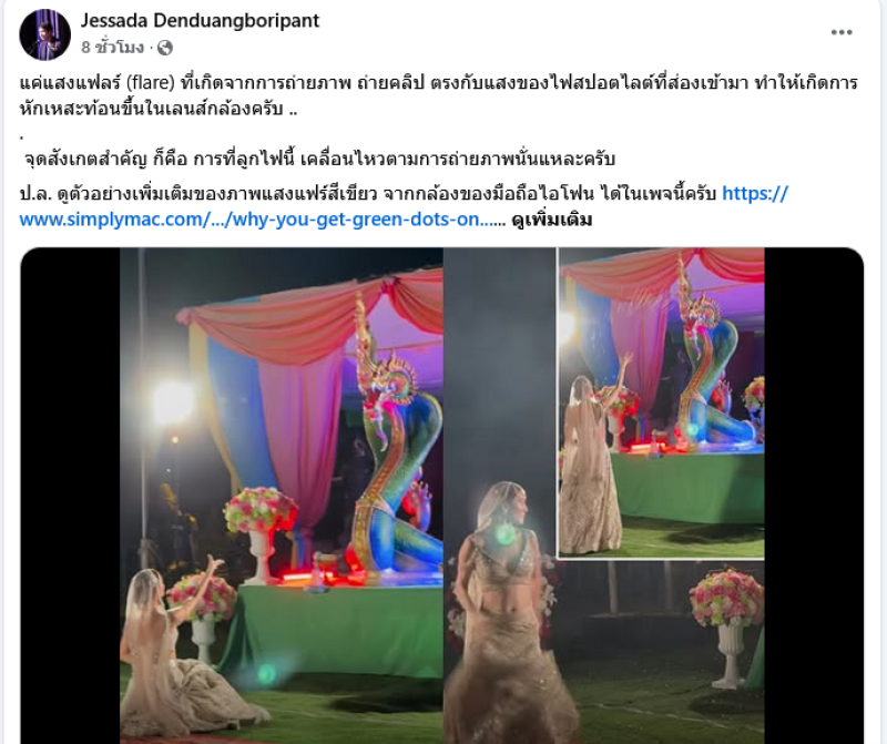 ล่าสุด รศ.ดร.เจษฎา เด่นดวงบริพันธ์ อาจารย์ประจำคณะวิทยาศาสตร์ จุฬาฯ ต้องออกมาไขข้อสงสัยผ่านโพสต์ชี้แจงทางวิทยาศาสตร์ว่า สิ่งที่หลายคนเห็นนั้นไม่ใช่เรื่องลี้ลับหรือพลังเหนือธรรมชาติแต่อย่างใด แต่เป็นแค่ แสงแฟลร์ (flare) ที่เกิดจากการหักเหของแสงในเลนส์กล้อง ขณะถ่ายภาพหรือวิดีโอที่มีสปอตไลต์ส่องเข้ามาตรงๆ ซึ่งแสงที่เห็นเคลื่อนไหวก็เพราะว่ากล้องเคลื่อนไหวนั่นเอง