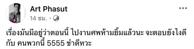 ล่าสุด อาร์ต ไม่ปล่อยผ่าน โพสต์ผ่านเฟซบุ๊ก Art Phasut และแคปภาพคอมเมนต์ พร้อมเปิดหน้าบัญชีผู้วิจารณ์ และแคปชั่นแรงว่า ตอนนี้ไปงานศพห้ามยิ้มแล้วนะ จะตอบยังไงดีกับคนพวกนี้ 5555 ขำดีหวะ