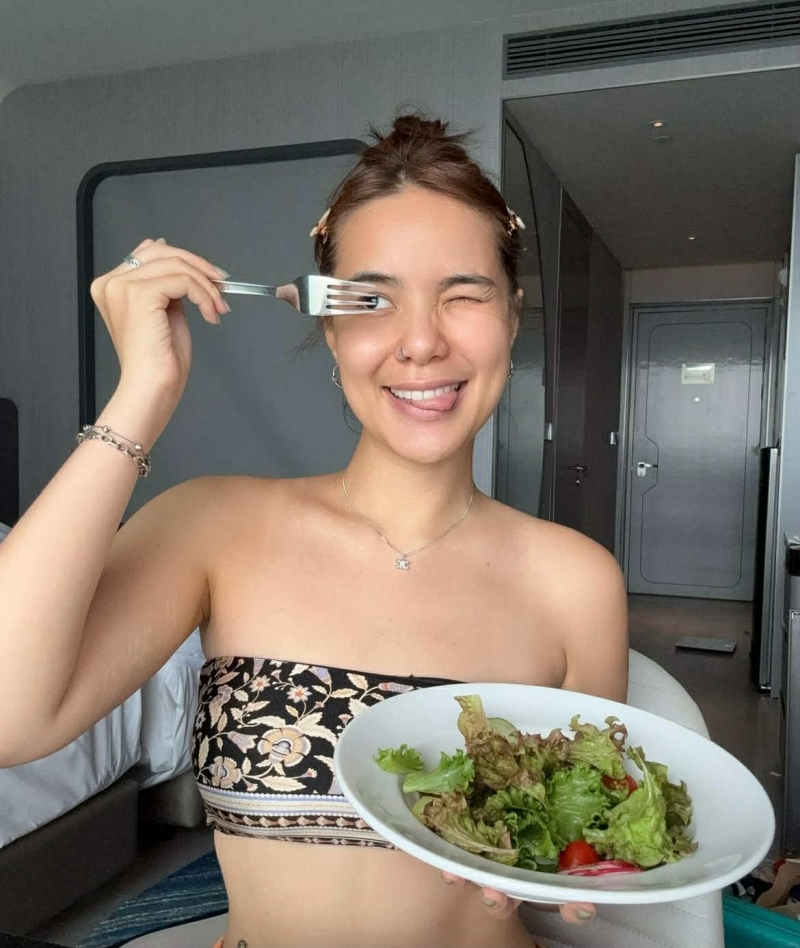 ซึ่ง ในมือยังถือเมนูสลัดผักเพื่อสุขภาพ พร้อมแคปชั่นภาษาอังกฤษสุดเฉียบที่พูดถึงลักษณะของสาวพฤศจิกาแบบมีสไตล์ว่า NOVEMBER GIRL Signature Traits: Private, deeply emotional, powerful presence, doesn trust easily.
