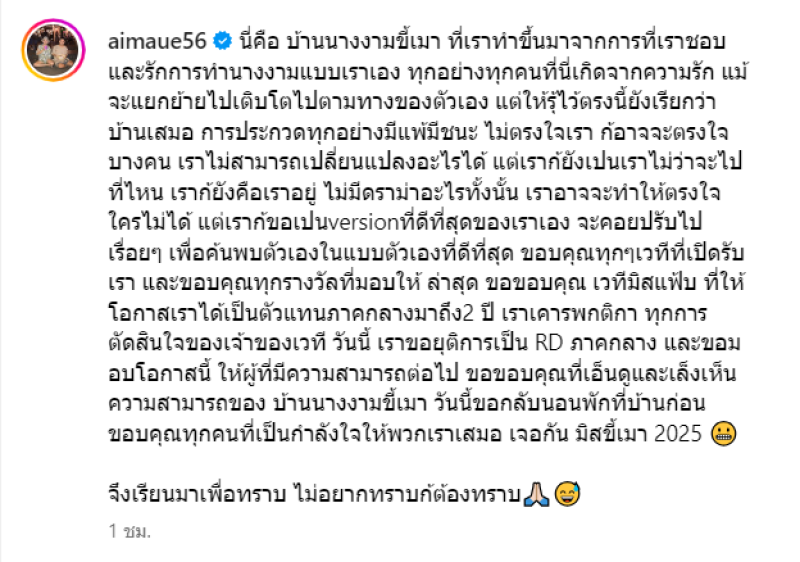 ขอบคุณทุกๆเวทีที่เปิดรับเรา และขอบคุณทุกรางวัลที่มอบให้ ล่าสุด ขอขอบคุณ เวทีมิสแฟ้บ ที่ให้โอกาสเราได้เป็นตัวแทนภาคกลางมาถึง2 ปี เราเคารพกติกา ทุกการตัดสินใจของเจ้าของเวที วันนี้ เราขอยุติการเป็น RD ภาคกลาง และขอมอบโอกาสนี้ ให้ผู้ที่มีความสามารถต่อไป ขอขอบคุณที่เอ็นดูและเล็งเห็นความสามารถของ บ้านนางงามขี้เมา วันนี้ขอกลับนอนพักที่บ้านก่อน ขอบคุณทุกคนที่เป็นกำลังใจให้พวกเราเสมอ เจอกัน มิสขี้เมา 2025