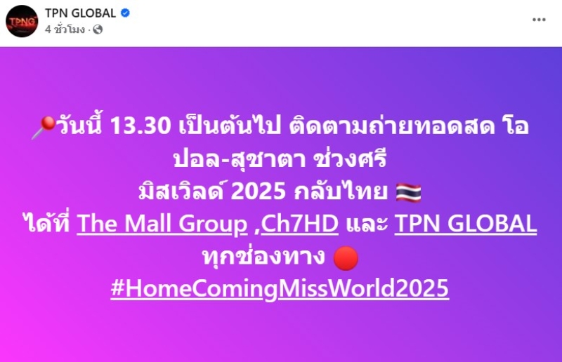 จากกรณีที่ก่อนหน้านั้น ทาง โอปอล สุชาตา ได้สร้างประวัติศาสตร์หน้าใหม่ให้กับวงการนางงามไทยอีกครั้ง ที่ได้คว้ามงฟ้า Miss World 2025 มาให้คนไทยได้สำเร็จ จากที่รอคอยมานานกว่า 72 ปี ล่าสุด วันนี้ ทางโอปอล สุชาตา และ จูเลีย มอร์ลีย์ เจ้าของและประธานองค์กรมิสเวิลด์ ได้เดินทางมาถึงประเทศแล้วในช่วงเช้า และในช่วงบ่าย จะมีการแห่ โอปอล ต้อนรับรอบเมือง