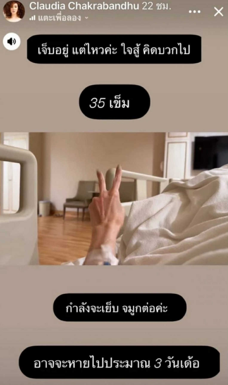 เรียกได้ว่า ทำเอาแฟนๆ หลายคนเป็นห่วงกันอย่างมาก เมื่อเกิดเหตุไม่ทันตั้งตัว ล่าสุด นักแสดงสาวชื่อดัง คลาวเดีย จักรพันธุ์ ได้ออกมาโพสต์ภาพ ขณะนอนแอดมิทในโรงพยาบาลผ่านอินสตาแกรมสตอรี่ claudia_chakrabandhu พร้อมมีข้อความว่า เจ็บอยู่ แต่ไหวค่ะ ใจสู้ คิดบวกไป 35 เข็ม กำลังจะเย็บจมูกต่อค่ะ อาจจะหายไปประมาณ 3 วันเด้อ