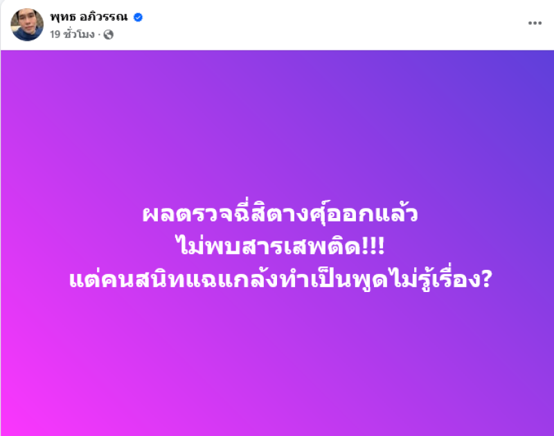 มีบางช่วงบางตอนแม่สิตางศุ์พูดไปร้องไห้ไป แทบฟังไม่ออก จนคุณพุทธต้องให้นักข่าวพาไปพัก ไม่สัมภาษณ์ต่อทันที ทำหลายคนเป็นห่วง แต่หลายคนก็สงสัยว่าเป็นอะไร เริ่มพูดไม่รู้เรื่องแล้ว ล่าสุด คุณพุทธ โพสต์เฟซบุ๊ก พุทธ อภิวรรณ ระบุว่า ผลตรวจฉี่สิตางศุ์ออกแล้ว ไม่พบสารเสพติด!!! แต่คนสนิทแฉแกล้งทำเป็นพูดไม่รู้เรื่อง?