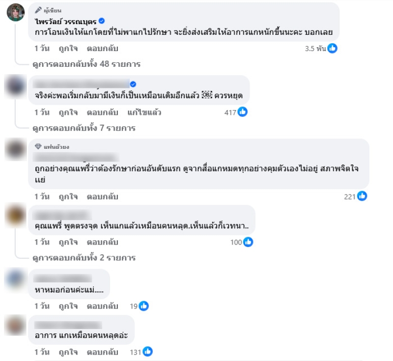 ชื่อเสียงหดหาย ชีวิตคู่พัง การงานการเงินพัง ชีวิตไร้ที่พึ่ง หมดหนทางไป เห้อออ เห็นใจมากค่ะ การโอนเงินให้แกโดยที่ไม่พาแกไปรักษา จะยิ่งส่งเสริมให้อาการแกหนักขึ้นนะคะ บอกเลย
