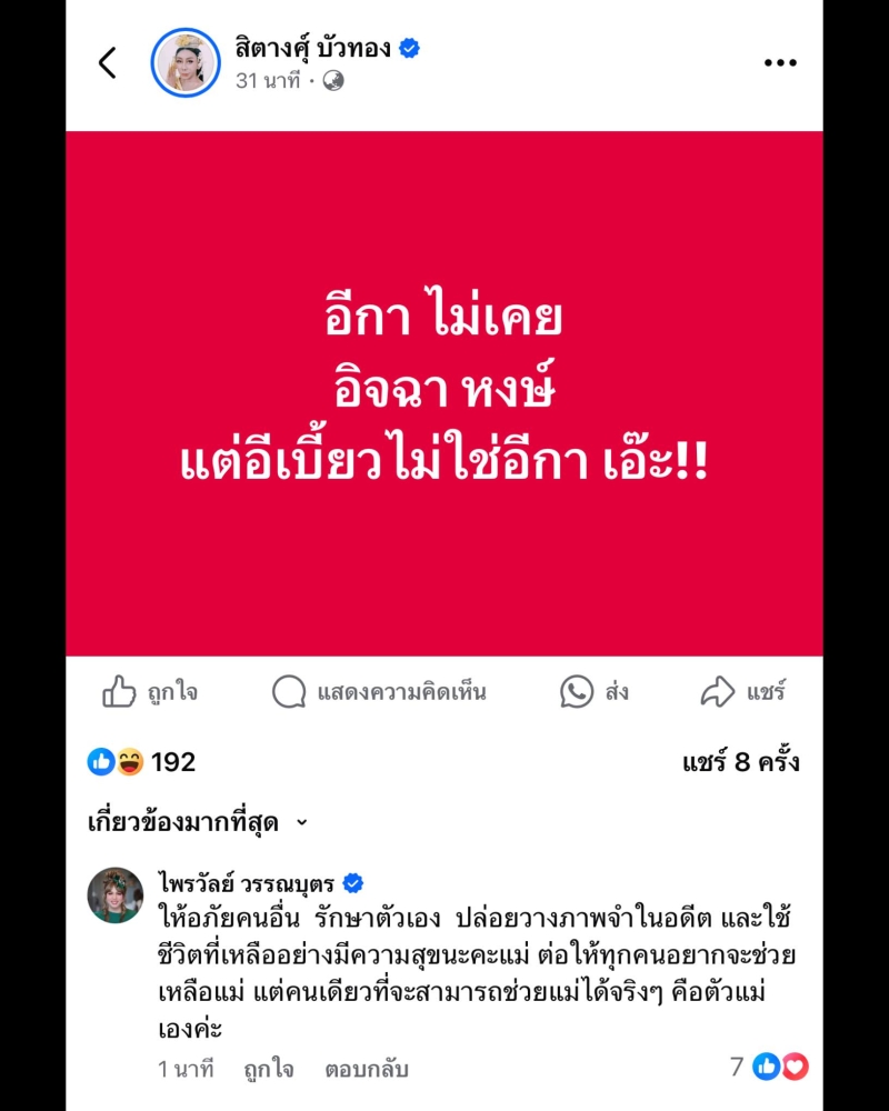 จากกรณีที่ สิตางศุ์ บัวทอง ได้ออกมาเผยชีวิตปัจจุบัน พร้อมออกมาโพสต์ล่าสุดว่า อีกาไม่เคยอิจฉาหงษ์ แต่อีเบี้ยวไม่ใช่อีกา เอ๊ะ!! ด้านแพรรี่ คอมเมนต์บอกว่า ให้อภัยคนอื่น รักษาตัวเอง ปล่อยวางภาพจำในอดีต และใช้ชีวิตที่เหลืออย่างมีความสุขนะคะแม่ ต่อให้ทุกคนอยากจะช่วยเหลือแม่ แต่คนเดียวที่จะสามารถช่วยแม่ได้จริงๆ คือตัวแม่เองค่ะ