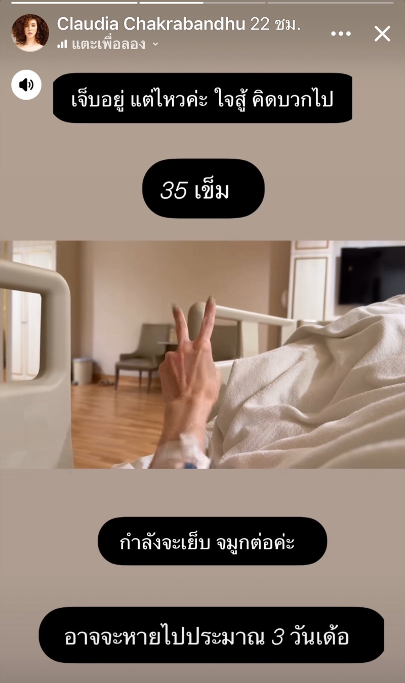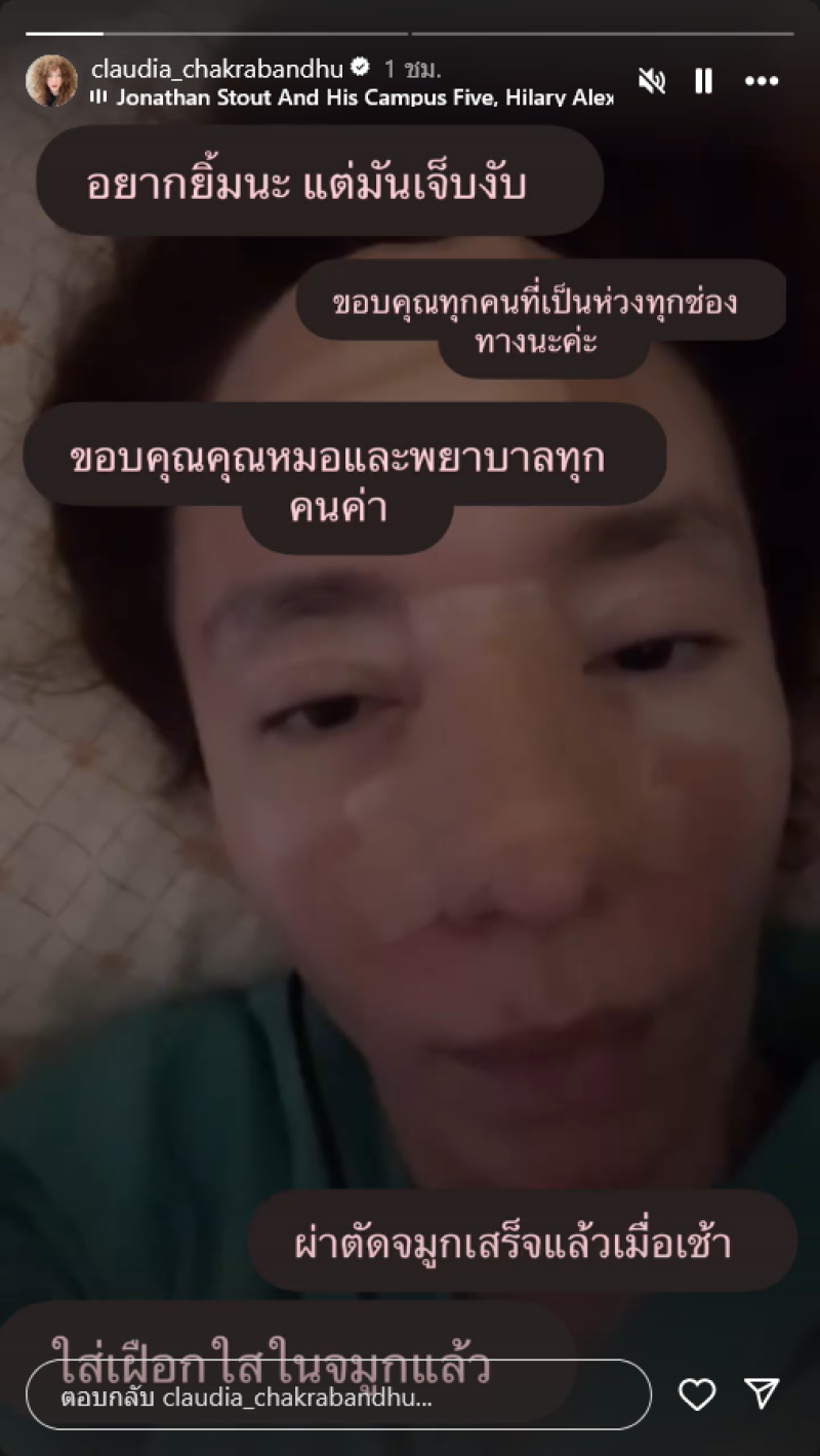 ล่าสุด คลาวเดีย ได้ออกมาเคลื่อนไหวผ่านทางสตอรี่อินสตาแกรม claudia_chakrabandhu ระบุว่า อยากยิ้มนะแต่มันเจ็บงับ ขอบคุณทุกคนที่เป็นห่วงทุกช่องทางนะค่ะ ขอบคุณคุณหมอและพยาบาลทุกคนค่ะ ผ่าตัดจมูกเสร็จแล้วเมื่อเช้า ใส่เฝือกใสในจมูกแล้ว