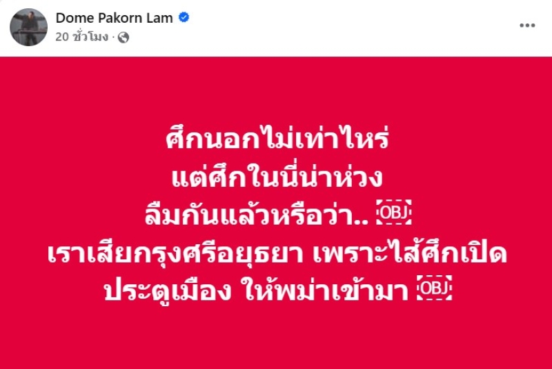 เรียกได้ว่า กระแสระหว่างแดนไทย-กัมพูชานั้น แรงอย่างต่อเนื่อง เพราะผู้คนและประชาชนต่างให้ความสนใจกับเรื่องนี้เป็นอย่างมาก โดยก็ได้มีดาราและคนดังที่ก่อนหน้านั้นก็ออกมารีแอคเช่นกัน ล่าสุดทางพระเอก-นักร้องดัง อย่าง โดม ปกรณ์ ลัม ก็ได้ออกมาโพสต์ว่า ศึกนอกไม่เท่าไหร่ แต่ศึกในนี่น่าห่วง ลืมกันแล้วหรือว่า เราเสียกรุงศรีอยุธยา เพราะไส้ศึกเปิดประตูเมือง ให้พม่าเข้ามา