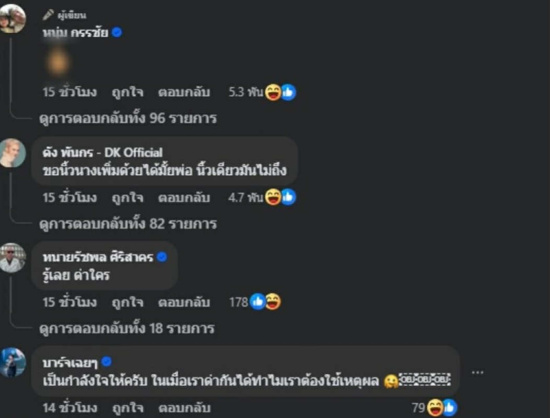 งานนี้ คนบันเทิง และ คนดังหลายวงการเข้ามาคอมเมนต์กันเพียบ อย่าง ดัง พันกร บอกแซ่บๆ ว่า ขอนิ้วนางเพิ่มด้วยได้มั้ยพ่อ นิ้วเดียวมันไม่ถึง