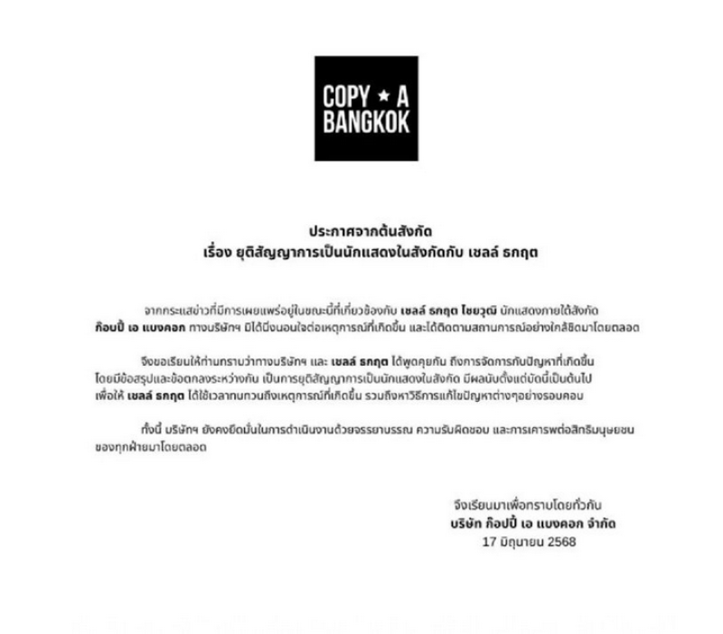 วันที่ 17 มิ.ย.68 บริษัท ก๊อปปี้ เอ แบงคอก จำกัด ซึ่งเป็นต้นสังกัดของ “เชลล์ ธกฤต ไชยวุฒิ” ได้ออกหนังสือยุติสัญญากับ ‘เชลล์ ธนกฤต’ โดยระบุว่า