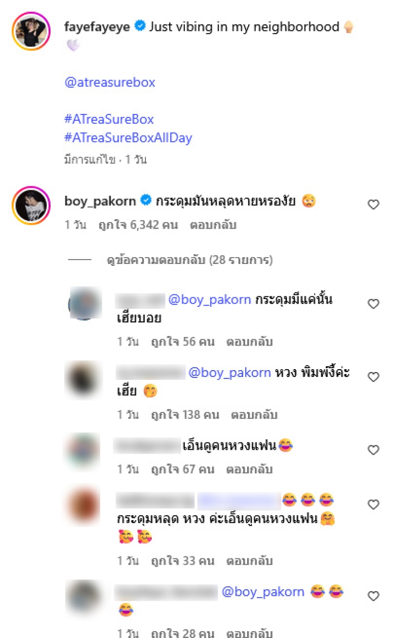 ล่าสุดทางด้าน เฟย์ ได้ออกมาโพสต์กับลุคน่ารัก สดใส ผ่านทางอินสตาแกรม fayefayeye โดยทางด้าน บอย ปกรณ์ ที่ได้เห็นชุด รีบเข้ามาคอมเมนต์แซวทันทีว่า กระดุมมันหลุดหายหรองัย ท่ามกลางแฟนๆต่างเข้ามาคอมเมนต์แซวบอยกันอย่างมาก