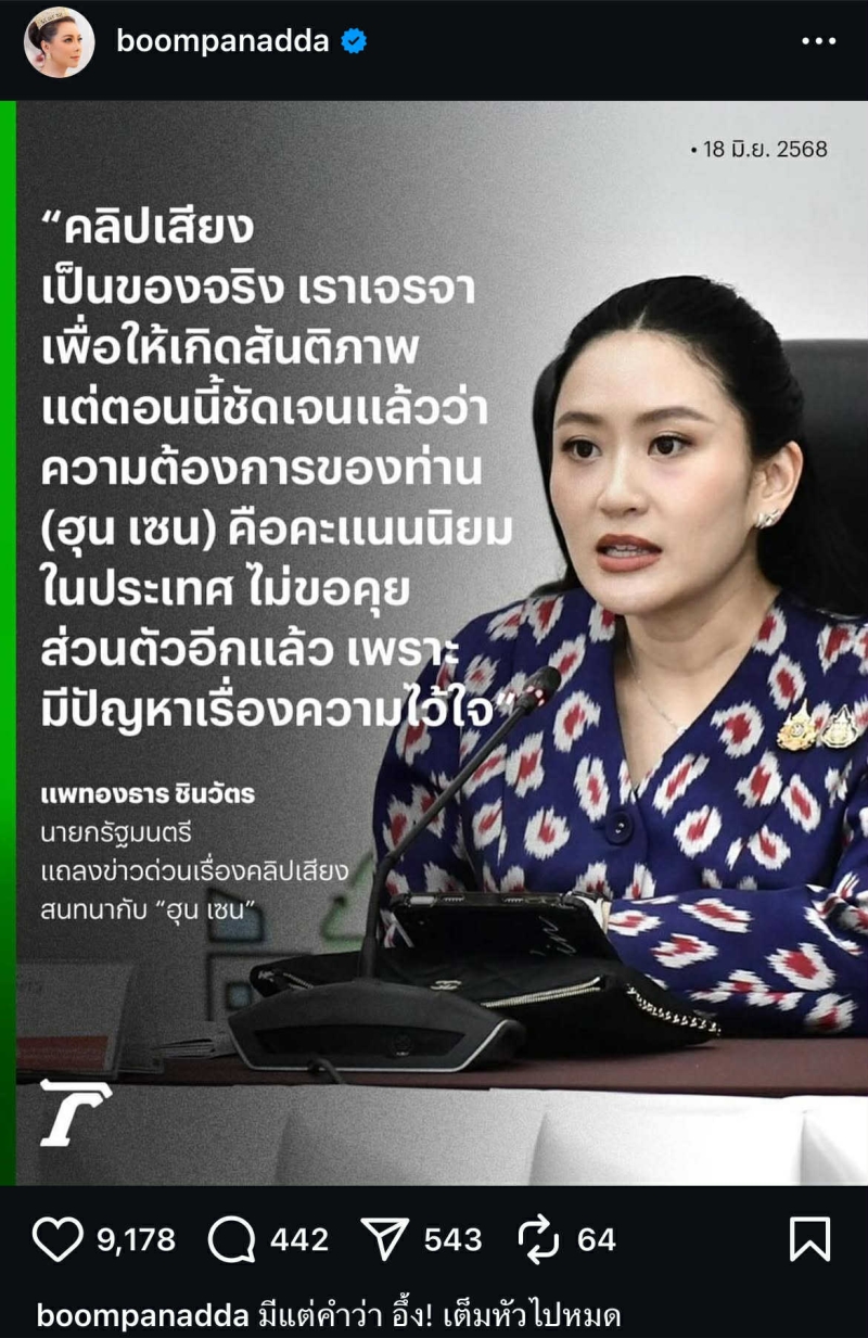 เรียกได้ว่า เป็นกระแสร้อนแรงในโลกออนไลน์ทันที หลัง น.ส.แพทองธาร ชินวัตร นายกรัฐมนตรี ออกมาแถลง เมื่อวันที่ 18 มิ.ย. 68 ยอมรับว่า คลิปเสียงสนทนากับ สมเด็จฮุน เซน อดีตนายกรัฐมนตรีกัมพูชา เป็นของจริง
