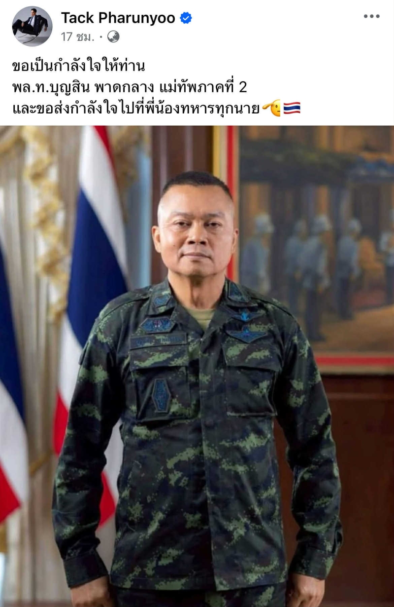จากนั้นไม่นาน แทค ยังโพสต์ภาพ พล.ท.บุญสิน พาดกลาง แม่ทัพภาคที่ 2 พร้อมข้อความส่งกำลังใจให้ ท่าน และ ทหารทุกนาย ว่า ขอเป็นกำลังใจให้ท่าน พล.ท.บุญสิน พาดกลาง แม่ทัพภาคที่ 2 และขอส่งกำลังใจไปที่พี่น้องทหารทุกนาย