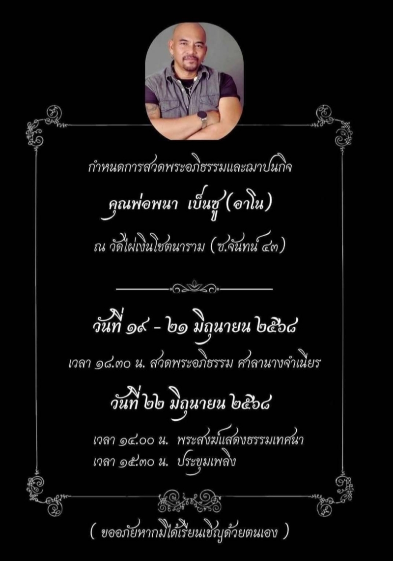 กำหนดการสวดพระอภิธรรมและฌาปนกิจ คุณพ่อพนา เบ็นชู(อาโน)