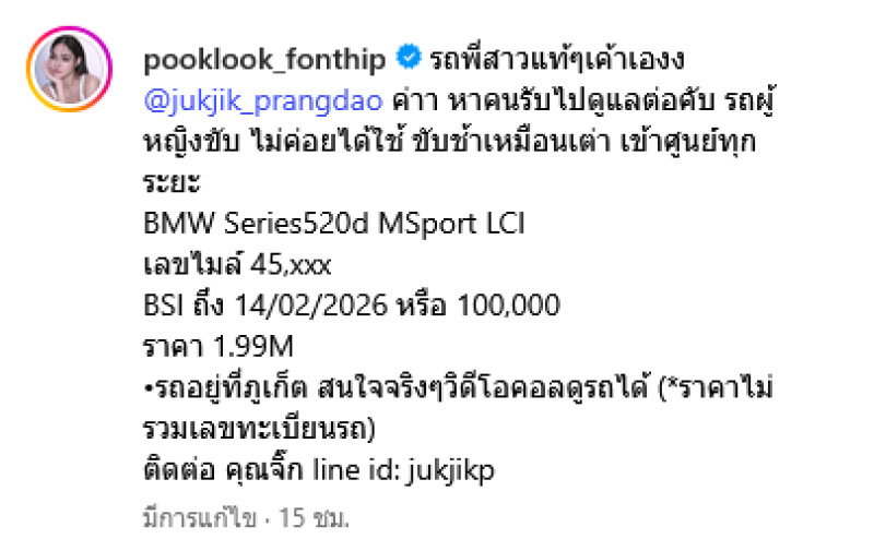 เรียกได้ว่าเป็นอีกหนึ่งนางเอกสาวอย่าง ปุ๊กลุก ฝนทิพย์ วัชรตระกูล ที่ล่าสุดได้ออกมาโพสต์ประกาศขายรถหรู ผ่านทางอินสตาแกรม pooklook_fonthip พร้อมเผยรายละเอียดว่า รถพี่สาวแท้ๆเค้าเอง @jukjik_prangdao ค่าา หาคนรับไปดูแลต่อคับ รถผู้หญิงขับ ไม่ค่อยได้ใช้ ขับช้าเหมือนเต่า เข้าศูนย์ทุกระยะ